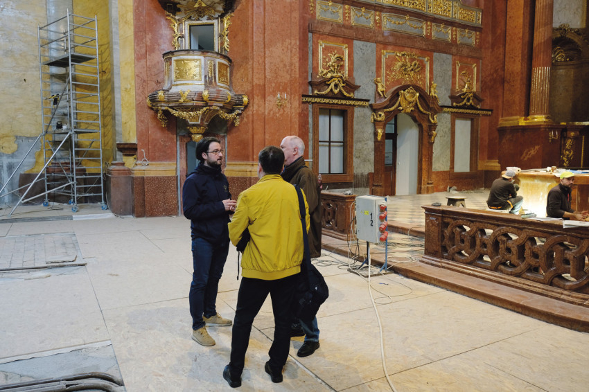 „Kiterjesztett kutatással indítottunk. Ha úgy álltunk volna hozzá a felújítási munkához, hogy ez pusztán csak restaurálás, az nem vezetett volna eredményre – kezdte a templom bemutatását az igazgató. – Minden olyan információval rendelkezünk kellett, ami alapján meghatározhattuk a helyreállítás alapelveit. Első lépésként felmértük, hogy mink van, és mit szeretnénk felújítani. El akartuk kerülni, hogy később derüljön ki, van még pótolni való. Ezért készítettünk egy értékleltárat, amely az építéstörténeti tudományos dokumentáció része, és egyébként kormányrendelet írja elő. Ezt a leltárat azonban, amely több mint nyolcszáz tételből áll, az előírásnál jóval részletesebben dolgoztuk ki. A szőnyegektől a karnisokon át a mennyezetképekig a templom valamennyi értékét végigvettük, a tárgyakkal és állapotukkal kapcsolatos minden adatot rögzítettünk. Ez a lista határozta meg a munka további menetét. Segítségével áttekinthettük, pontosan milyen műtárgyaink vannak, és ezekhez milyen restaurátorok együttműködésére lesz szükség. Szakágak szerint csoportosítottuk a feladatokat: kő-, műmárvány-, mennyezetkép-, táblakép-, szobor-, fa-, fém-, papír-, textilrestaurálási munkálatok. Emellett persze építészeti generáltervezésre is sor került, még most is folynak építőmesteri munkák, és épületgépészeti beavatkozások is történtek a kor elvárásainak megfelelő, modern kivitelben. Műemlék épületen végzett munkálatok esetében nagyon fontos figyelembe venni azt az alapelvet is, hogy a műemléknek részét képező minden egyes tárgynak önálló története is van, amelyhez sok esetben hozzátartoznak a megrendelői igények tekintetbe vételével lezajlott korábbi átalakítások, restaurálások. Mindezt fel kell tárni, így nem csak a helyszínen vallatjuk a műtárgyakat, hanem minden lehetséges forrásnak is utánanézünk.”