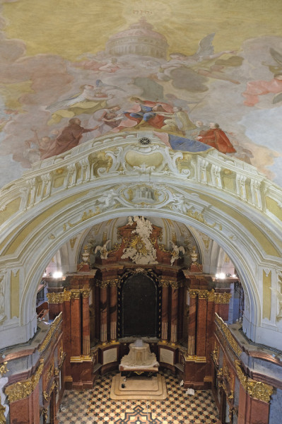 Érdekes a főoltár felett, a mennyezeten látható falikép is, amely a Szent István megdicsőülése címet viseli. A sziléziai származású bécsi oltárkép- és freskófestő, Johann Ignaz Cimbal alkotása fiatal férfiként jeleníti meg a szent királyt, akit a Szentháromság fogad a mennyben. Szent István más alkotásokon általában szakállas, idős férfiként tűnik fel, ám itt élete delén, legszebb férfikorában láthatjuk. A 18. században a jezsuiták találták ki ezt a teológiai programot, ők kérték az osztrák mestert, hogy a freskón a király megdicsőült testét ereje teljében lévő, fiatal férfitestként ábrázolja.
