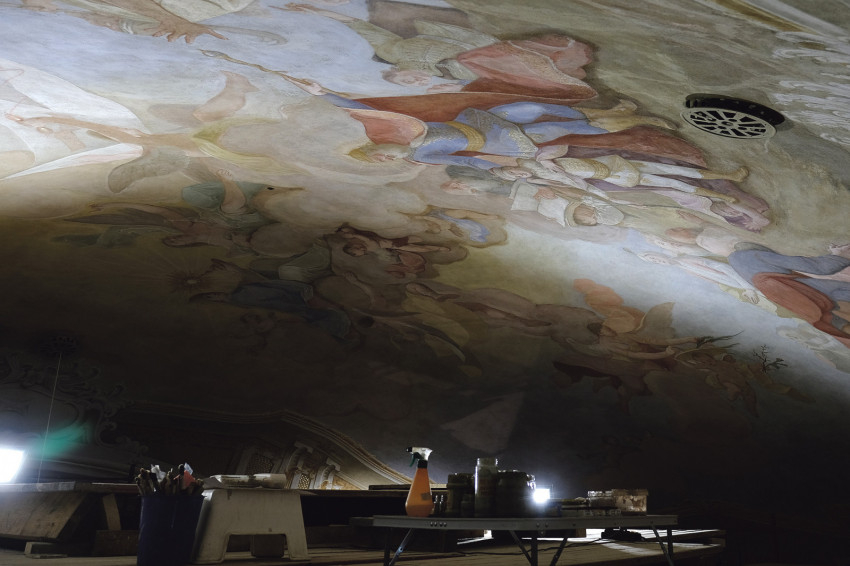 „2018-ban régészeti feltárást is végeztünk, melynek során sikerült tisztázni a templom középkori előzményeit, építéstörténetét. Ekkor derült ki, hogy a két, középkori alapú templomtorony építészeti szempontból másfajta tömegként viselkedik, mint a hozzá csatlakozó barokk falak és az orgonakarzat feletti boltozat. Ez a tornyokhoz illesztett későbbi szerkezet kezdettől fogva másképpen mozgott, mint a két masszív középkori épülettömb. Ennek következtében valószínűleg már száz éven belül komoly statikai problémák jelentkeztek, beázások keletkeztek, s így az orgonakarzat fölötti mennyezetkép rövid idő elteltével nagyon rossz állapotba került. A kutatások során világossá vált, hogy az 1768-ban szintén Cimbal által készített barokk freskó – amely egy trombitát fújó angyalt ábrázolt – teljesen elpusztult. 1866-ban felújításon esett át a templom. Az orgonakarzat feletti képmezőbe ekkor Heinrich Ede szekkótechnikával új képet festett, amely Szent Cecíliát, a zenészek védőszentjét ábrázolta angyalok társaságában. Az 1936-os és az 1958-as restaurálások idején olyan jelentősen módosították ezt a falképet, hogy a szakemberek a mostani munkálatok során nem tudták helyreállítani. Mivel a mennyezetkép műemléki értékű, kordokumentumként megőrzik, és a műemlékvédelmi szabályoknak megfelelően, izoláló réteg közbeiktatásával, reverzibilis technikával takarják el. A helyére pedig új műalkotás kerül, ami illeszkedik majd a barokk dekoráció egységéhez.