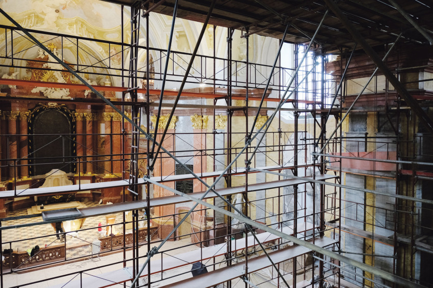 A főoltárkép és a mellékoltárok nagyméretű festményei még a restaurátorműhelyben vannak, helyükön egyelőre csak a szürkés, kopottas, üres falfelület látszik. A székesegyház hátsó, orgonakarzatos része teljes egészében fel van állványozva, a hatalmas, boltíves területet sűrűn elhelyezett vörös színű fémcsövek és deszkapallók uralják vagy húsz méter magasan. De, ahogyan Smohay Andrástól, a Székesfehérvári Egyházmegyei Múzeum igazgatójától hallhattuk, már nem sokáig; rövidesen elbontják az állványzatot.