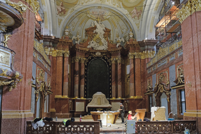 A székesegyházba belépve egy hamisítatlan magyarországi barokk templombelső tárult elénk. A hatalmas centrális térben még javában dolgoztak a munkások, csiszolták a vörösmárvány oltárasztal lábazatát, állványzatról javították az erős fénnyel megvilágított, márványozott falakat.