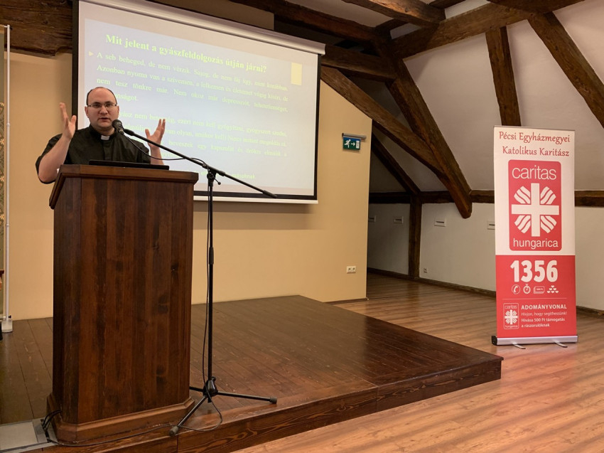 A napi szakmai program folytatásaként Battonyai János a gyász feldolgozásáról és annak a szociális segítségnyújtásban betöltött szerepéről tartott előadást, melyben leszögezte: az önkéntesszolgálat akkor lehet hatékony és eredményes, ha a munkatársak önmaguk is tudatosan foglalkoznak ezzel a témával, és reflektálnak a saját gyászukra, tisztában vannak veszteségfeldolgozási stratégiájukkal. A gyászfeldolgozás témája nagyon összetett, ezért hatalmas tudásanyagot igényel, de akkor is tudunk segíteni, ha nem tabuként kezeljük, és nem hagyjuk ki belőle Isten irgalmát – hangsúlyozta az előadó, majd Pilinszky János egyik írásából idézett: