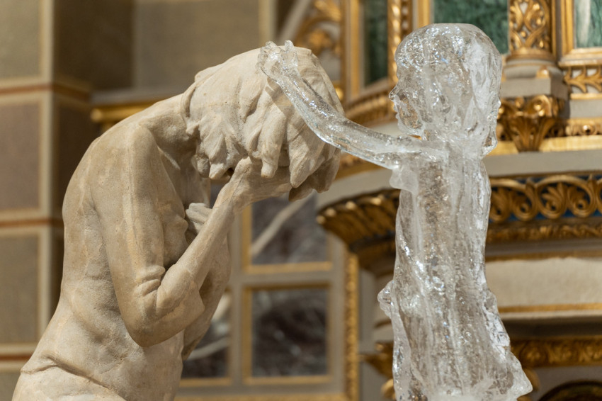 Az alkotás két személyt mutat be: a márványból készült, térdelő, arcát a tenyerébe fordító szomorú anyát, valamint a vele szemben álló, átlátszóan könnyed, üvegből készült, kezét az anya feje fölé helyező kislányt. A gyermek amellett, hogy megbocsátón az anya felé nyújtja a kezét, lép is felé.