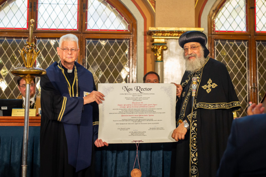 II. Tavadrosz megköszönte, hogy „a tudománynak ez az ősi fészke”, a Pázmány Péter Katolikus Egyetem őt és általa a Kopt Ortodox Egyházat méltónak találta a díszdoktori címre, ezzel kifejezve a tiszteletet „ama tevékenység iránt, amivel a szeretetet szolgáljuk, nemcsak Egyiptomban, hanem az egész világon”.