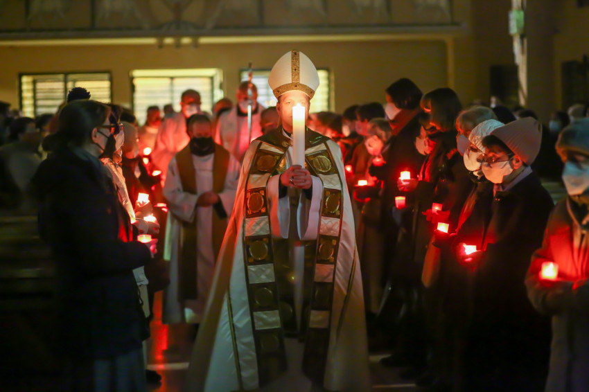 A szentmise előtt a templom elsötétedett. A kezdőének alatt égő mécsessel a kezükben, páros sorban jöttek a szerzetesnővérek a szentély elé és a padok közé, ezt követően a hívő közösség a Sacerdos et Pontifex kezdetű énekkel köszöntötte Mohos Gábort. A püspök a liturgia szavaival megemlékezett arról, hogy Szűz Mária és Szent József, amikor a negyvennapos Jézust bemutatták a templomban, nemcsak az ószövetségi törvényt teljesítették. Ekkor az Üdvözítő találkozott hívő népével. A jámbor öregek a Szentlélektől megvilágosítva felismerték az Urat, és örvendező lélekkel tettek tanúságot róla.