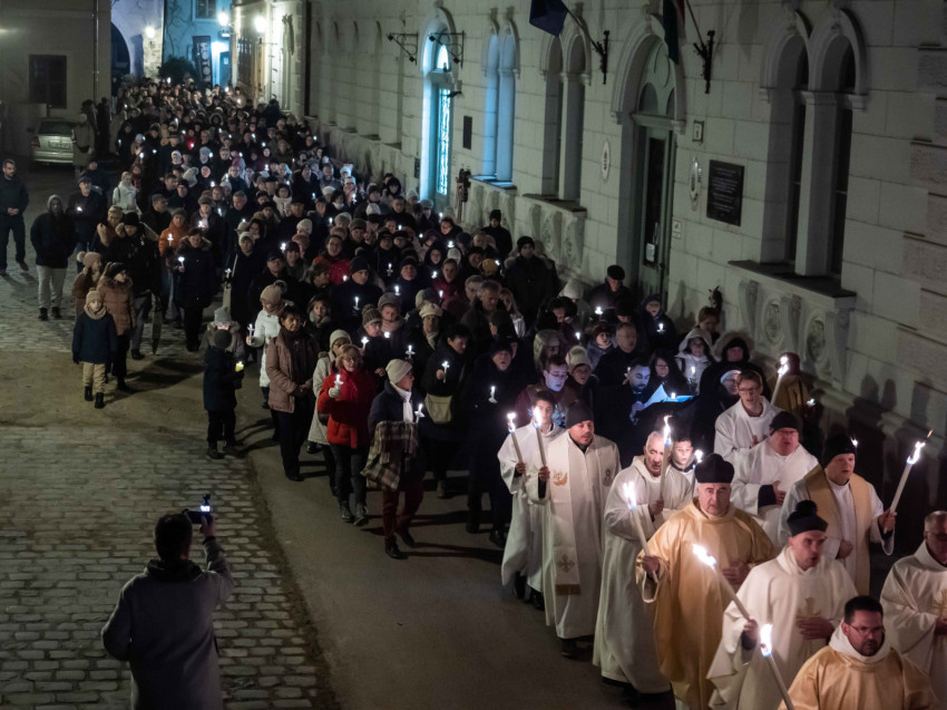 Ezt követően a hívek énekelve, gyertyákkal, mécsesekkel, fáklyákkal a kezükben vonultak a Szent Márton-templomtól a székesegyházig. Székely János megyéspüspök megnyitotta a jubileumi kaput, majd a kereszt előtti hódolat imáját énekelték a hívek. A megyéspüspök vizet áldott meg, majd a keresztségre való emlékezés jegyében meghintette vele a jelenlévőket.