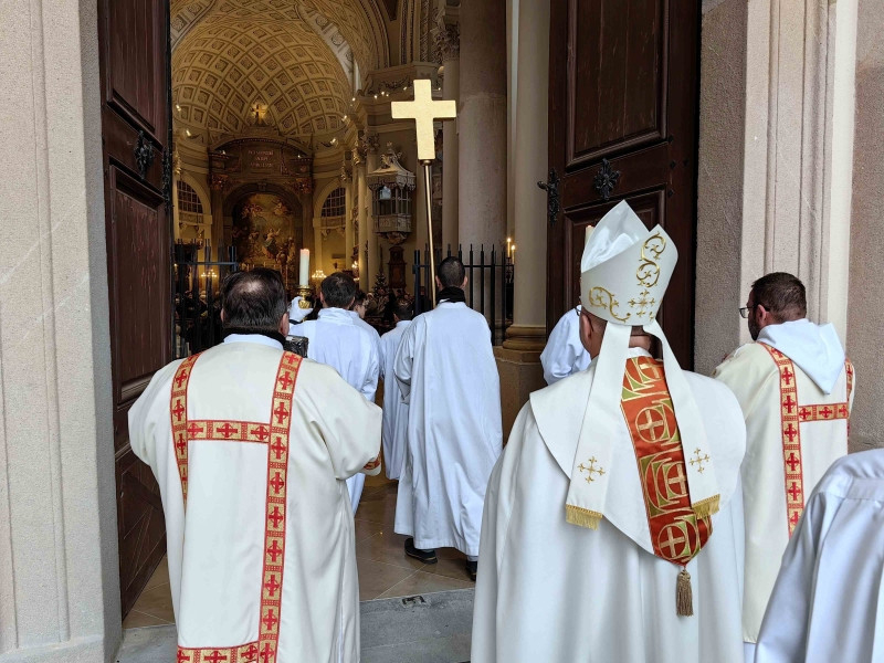 Ezt követően az asszisztencia és a hívek ünnepélyes körmenetben vonultak át a Nagyboldogasszony-székesegyházba a keresztet követve. A püspökkel koncelebrált Varga Lajos váci segédpüspök is.