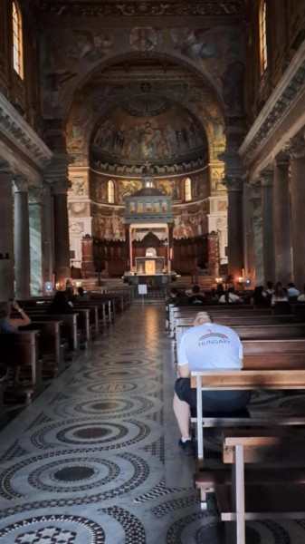 Első napunkon meglátogattuk a Santa Maria in Trastevere-bazilikát. Körbejárva, áhítattal figyeltük minden részletét, és az oltár előtt megállva görögkatolikus hívőként eszünkbe jutott az egyik legszebb imádságunk, a Jézus-ima. (...) a Jézus-ikon előtt énekeltünk, újabb csodákat átélve.