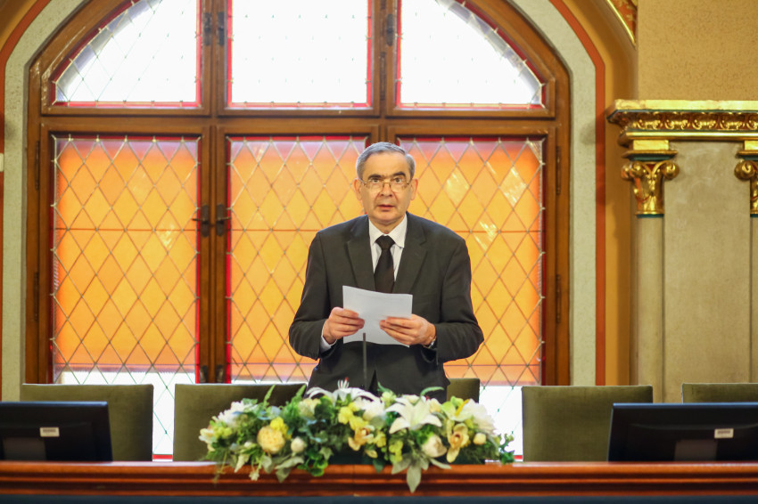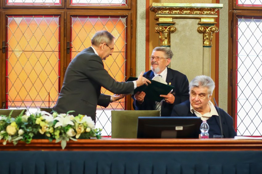 Varga Károly szociológius székfoglaló előadása betegség miatt elmaradt, de méltatását a jelenlevők meghallgatták Tringer László tolmácsolásában.