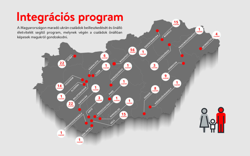 A tovább nem utazó családok Magyarországon maradásukhoz és a beilleszkedésükhöz kaptak támogatást. Tízezrek részesültek a mindennapos életüket megkönnyítő adományokból, 170 ukrán család pedig egyéves integrációs programba kapcsolódott be, hogy a későbbiekben saját keresetükből legyenek képesek eltartani magukat, miközben gyermekeik beilleszkednek a magyarországi óvodák, iskolák közösségeibe.