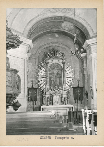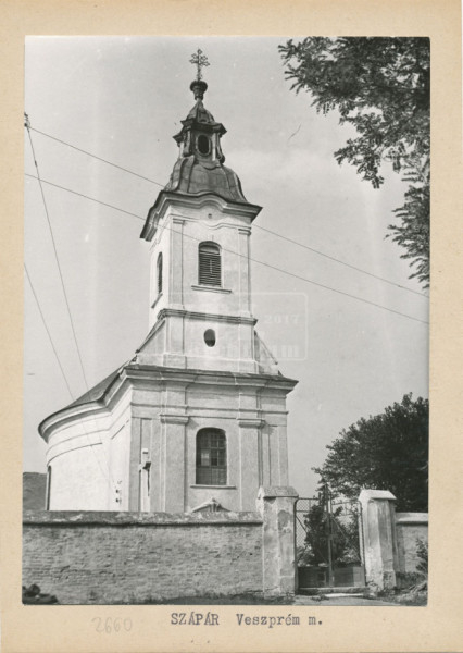 A ma is álló szápári templomot gróf Szapáry János fia, Pál (1753–1825) építtette 1770-ben, ahogy azt a kapu kőkeretén olvasható évszám is jelzi. Faller Jenő településtörténeti monográfiája (1934) idézi, hogy a szapáriak 1784 júniusában a veszprémi püspöktől már káplánt kérvényeztek, hivatkozva arra, hogy templomukat „néhány esztendő előtt … a Méltóságos Földes úr Saját Kegyes költségén megépítette”.