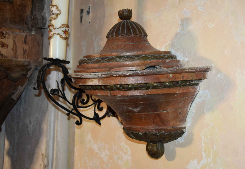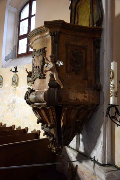 A 18–19. századi egyházlátogatási jegyzőkönyvek a kőrisfa főoltáron kívül két Szűz Mária-, egy Szent Anna-és egy Szent Vendel-képet, valamint egy faragott fa Szentháromság szobrot, „corulei colori” festett sekrestye szekrényt, gyóntató széket írnak le. A kiemelkedő kvalitású, eredeti barokk berendezésének néhány darabja a mai napig a templomban fennmaradt. Ezek fából gazdagon faragott és vöröses színnel márványmintásra színezett berendezési tárgyak: a keresztelő medence és a szószék.