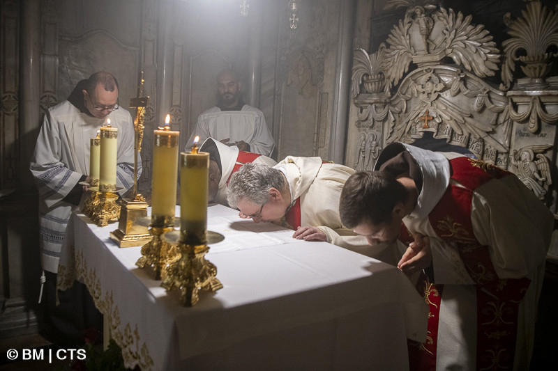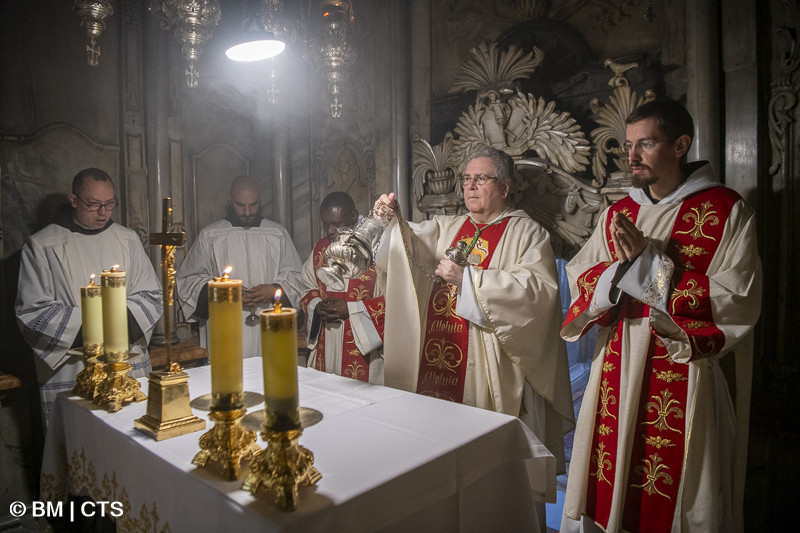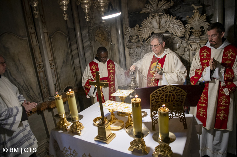 Francesco Patton kusztossal két koncelebráns léphetett be az apró helyiségbe: Stéphane Milovitch OFM, a Szent Sír őre és Carlos Malfa, az argentinai Chascomús eremitus megyéspüspöke.