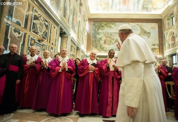 Ezután találkozott a Rota Romana vatikáni bíróság dékánjával, Pio Vito Pinto püspökkel, valamint a törvényszék prelátus ügyhallgatóival (auditoraival). Ferenc pápa délben a Kelemen-teremben hivatalosan megnyitotta a Rota Romana törvényszéki évadát.