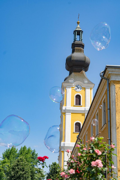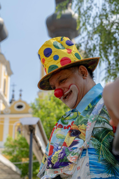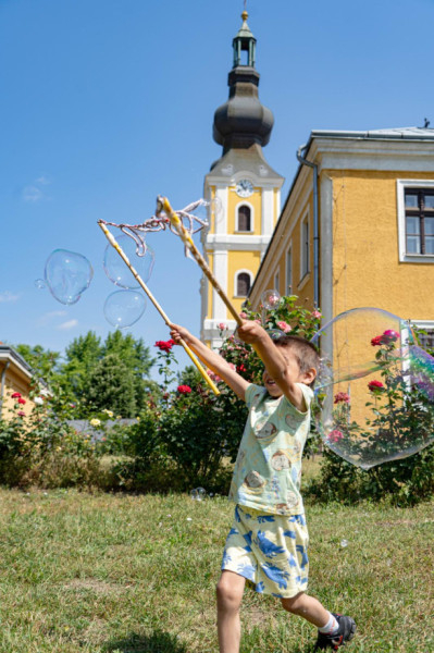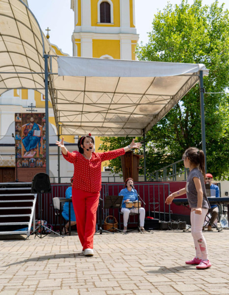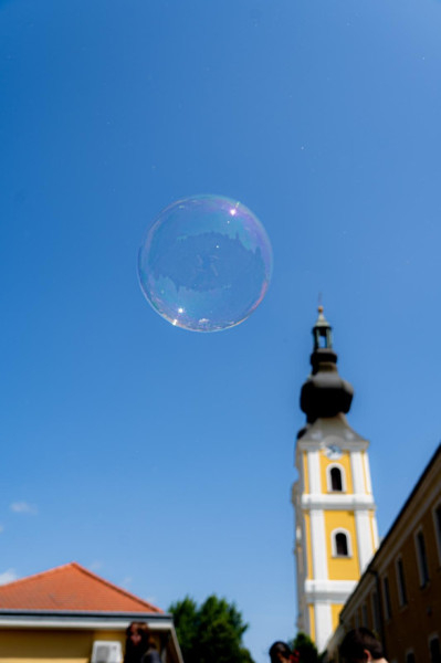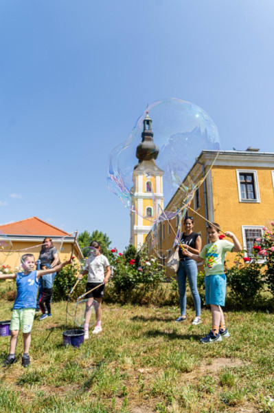 A fatemplom mellett az Óriás Buborék Show buborékbűvölői várták a gyerekeket, akik csillogó szemekkel és mosollyal az arcukon kergették a kegytemplom felé szálló hatalmas gömböket.