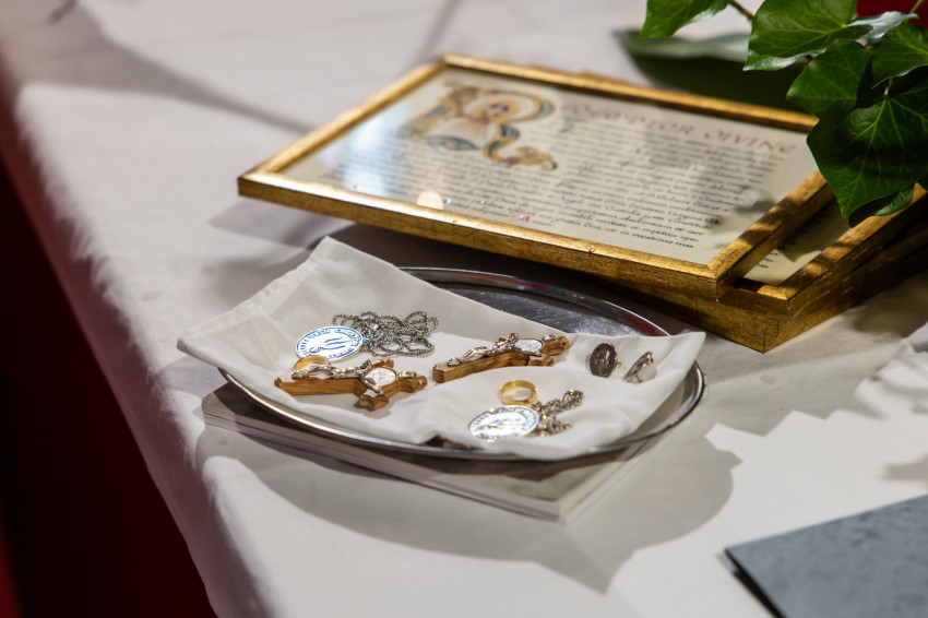 Marton Zsolt megáldotta a fogadalmi jelvényeket, a feszületeket és a gyűrűket, melyet az elsőfogadalmas testvérek fognak viselni, majd a jelenlévők megújították keresztségi fogadalmukat.