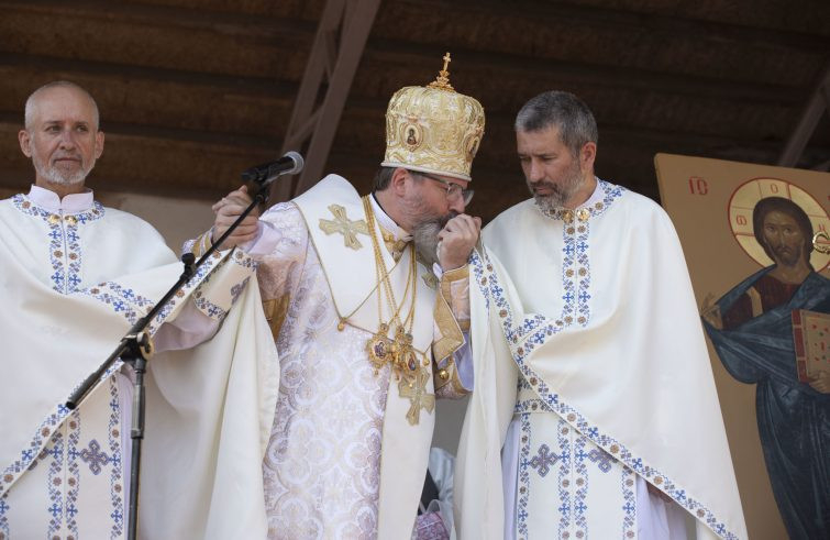 „Hálát adunk Istennek, hogy életben vagytok. Ma itt vagytok velünk, és a remény jele vagytok ukránok ezrei számára. Engedjétek meg, hogy anyaszentegyházunk nevében kifejezzem hálámat nektek, és szimbolikus gesztust tegyek: megcsókolom a kezeteket” – mondta az ukrán görögkatolikus egyház feje július 14-én, vasárnap a Zarvanyicában bemutatott Isteni Liturgia végén a fogságból nemrég kiszabadult két papnak.