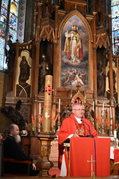Német László érsek prédikációjában rámutatott, hogy a mai világban különféle tragédiák történnek: közelünkben háború dúl, amely már második éve tart, Afrikában még több a háború, számos természeti katasztrófát élünk meg, mint például a marokkói földrengés vagy az árvíz Líbiában, amely több mint tízezer emberéletet vett el.