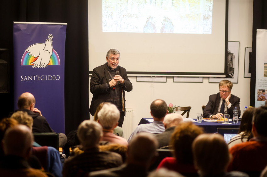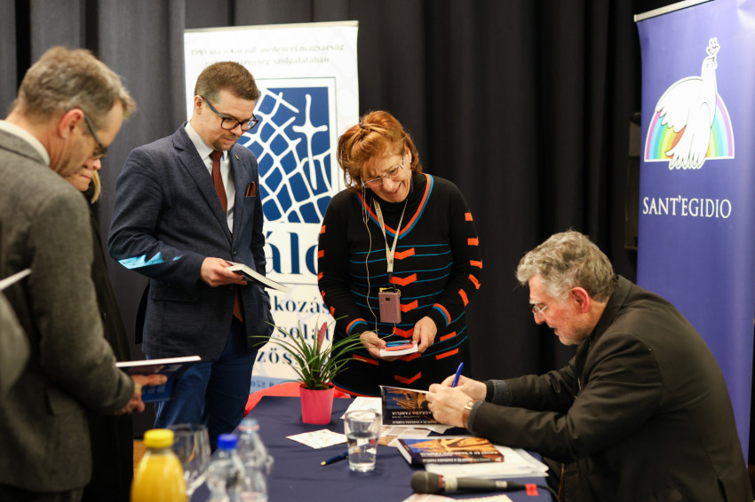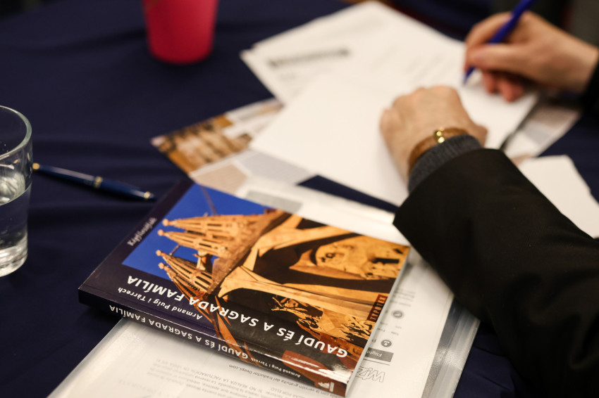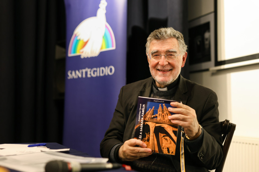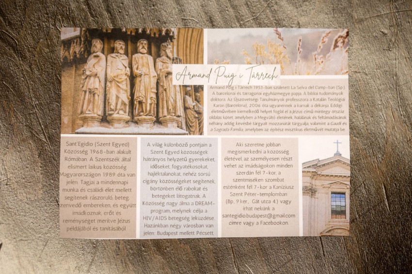A katalán építész mesterművéről szóló programot a Sant’Egidio közösség szervezte. Az előadót Szőke Péter, a közösség budapesti és regionális felelőse mutatta be. „Armand Puig i Tàrrech professzornak, protodékánnak, egykori rektornak sok címe van, de a legfontosabb az, hogy a barátunk” – mondta. Armand atya könyvet is írt a Sagrada Famíliáról, amit így dedikált: „Barátaimnak a Sant’Egidio közösségben”.