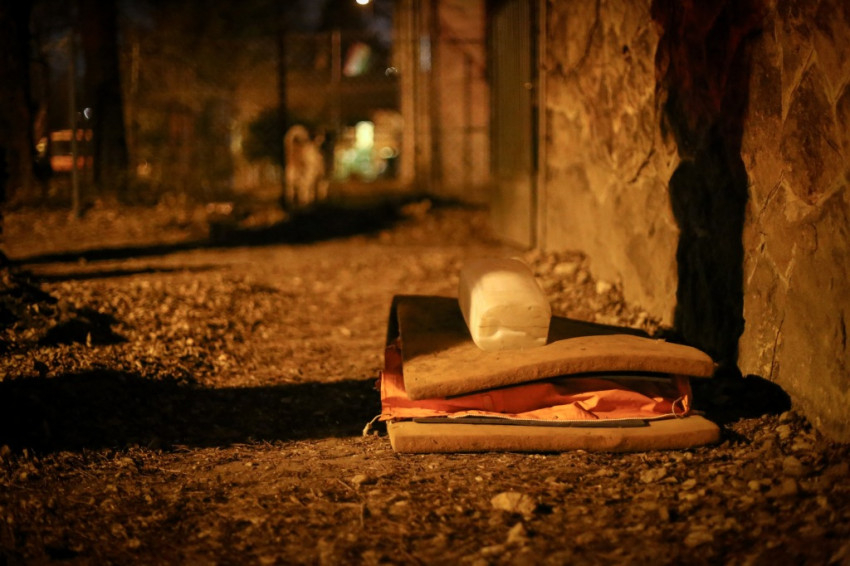 Következő állomásunk, már újra a városban, egy étel- és italkülönlegességeket kínáló éttermecske előtti fedett rész a lakótelep mellett, ahol két idősebb, szakállas férfi ül. Az egyikük egy széken, a másikuk egy beton virágládába helyezett matracon, combján hálózsákkal. Barátságos kutya fekszik mellette. „Ő vigyáz ránk éjjel” – mondja.