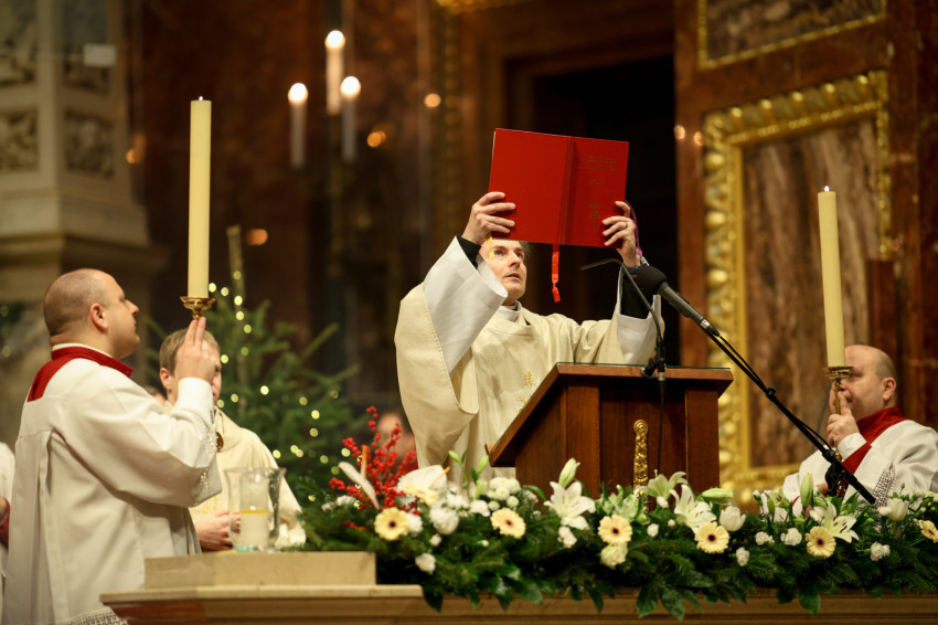 Homíliájában Erdő Péter a karácsony lényegére irányította a figyelmet: Jézus születése örömet hoz az életünkbe, de a jel, amelyet az angyal a pásztoroknak ígért, meglepően egyszerű – egy kisgyermek a jászolban. Ez az egyszerűség azonban mély üzenetet hordoz: Isten szeretete nem a kényelemben, hanem az önátadásban mutatkozik meg.