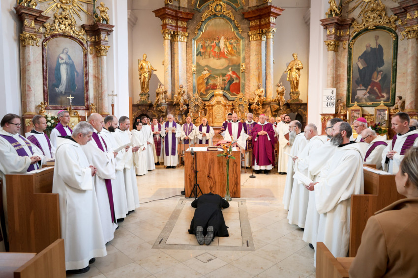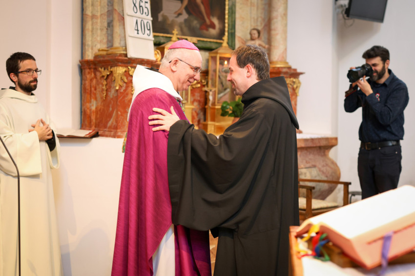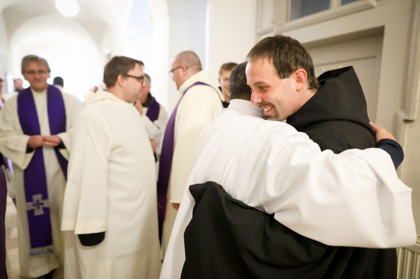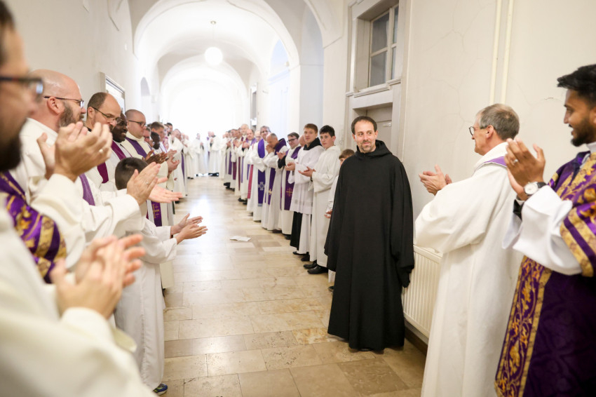 Megáldotta a kórusruhát, amit felsegítettek az örökfogadalmas szerzetesre, aki aztán békecsókot váltott bencés közösségének tagjaival.