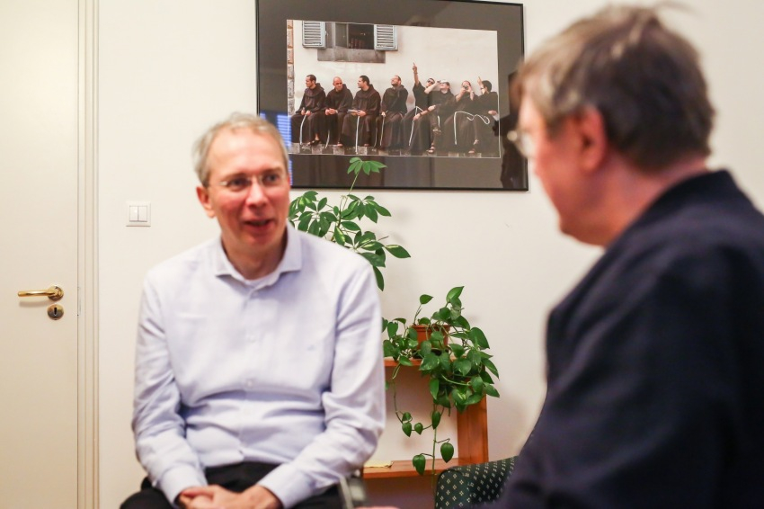 A templom plébániáján beszélgetünk Meskó Zsolttal, aki rendezte is a darabot; a 25 éves, mai fiatalembert megjelenítő Hillier Marcell-lal, a Kísértőt játszó Andréka Ágostonnal és a Veronikát alakító Gábor Mónikával.