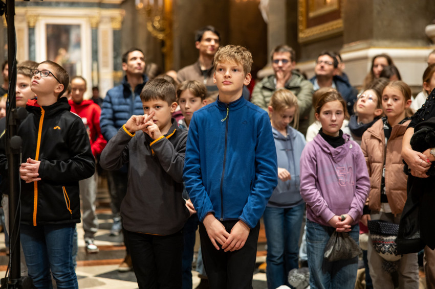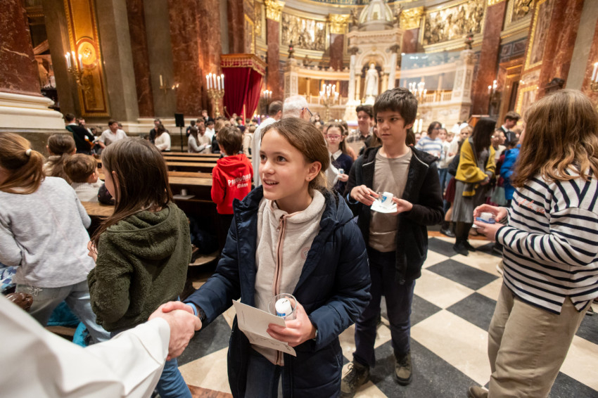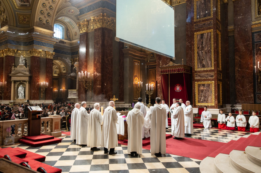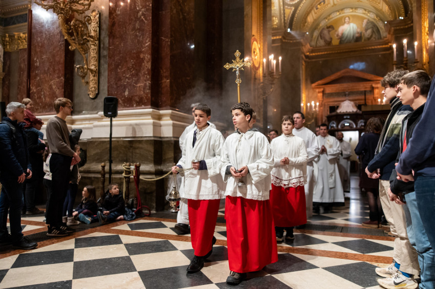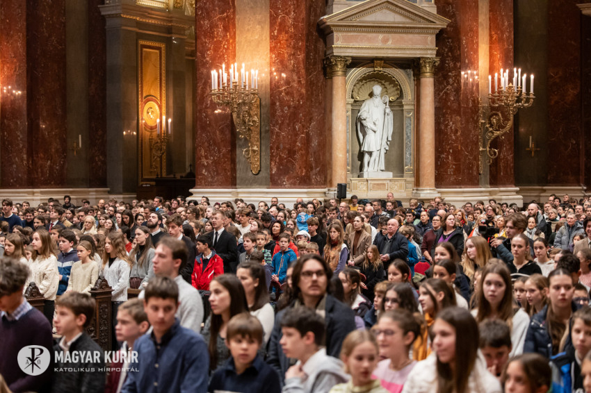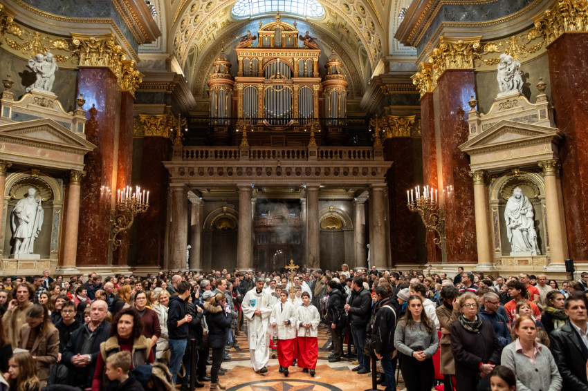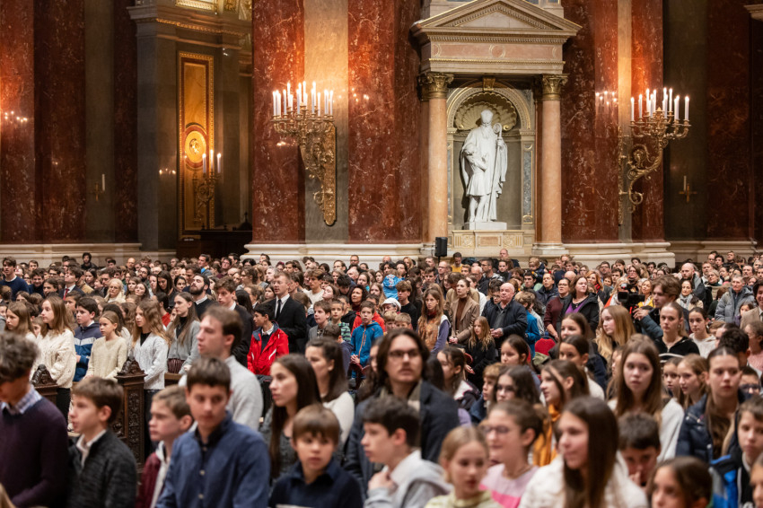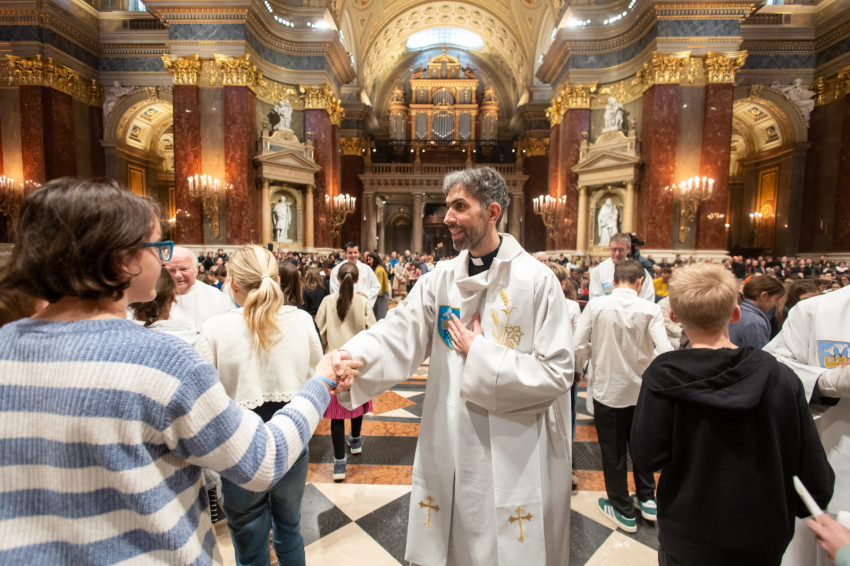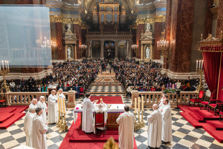 Az ünnepi szentmisére való bevonulás után a Regnum házfőnöke, Horváth István köszöntötte a koncelebráló, meghívott és regnumi atyákat, valamint az ország számos pontjáról érkezett gyerekeket, fiatalokat és vezetőiket, családtagjaikat, akik teljesen megtöltötték a bazilika hatalmas épületét.