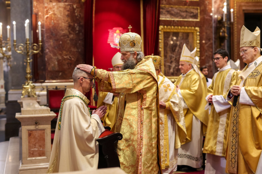 Ezután szent krizmával kente meg Erdő Péter bíboros a szentelendő fejét, és átadta neki a püspöki jelvényeket: az evangéliumos könyvet, a püspöki gyűrűt, a mitrát és a pásztorbotot. Ezt követően az új püspök békeköszöntést váltott minden püspökkel.