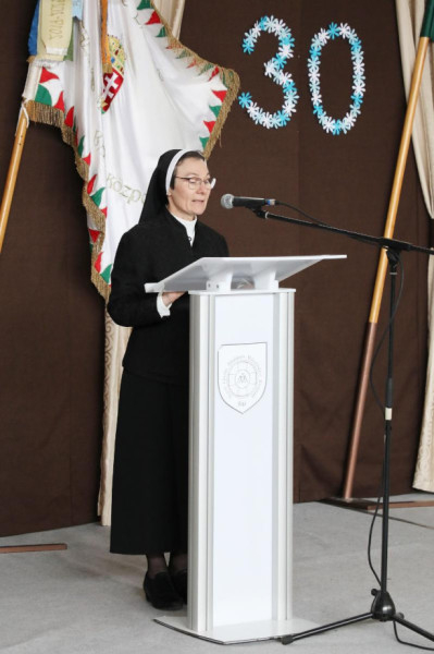 Az ünnepség az iskola Rátvay Zoltán Sportcsarnokában folytatódott, ahol elsőként Dávid M. Bernadette, az intézményt fenntartó szerzetesrend, a Miasszonyunkról Nevezett Kalocsai Iskolanővérek általános főnöknője mondta el ünnepi beszédét.
