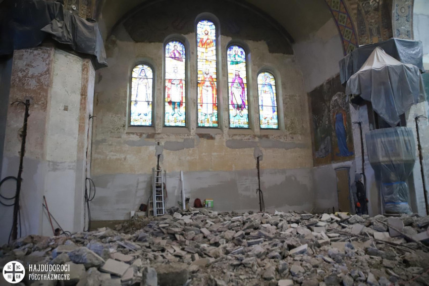 A szentélyben a hat ablakból négyet már feltártak. Két ablaknál a három debreceni mártír festménye van a falon, amit a tervek szerint a restaurátor speciális technikával egyben levesz onnan. Ha ez megtörténik, utána kinyílik majd a másik két ablak is, ami teljesen világossá teszi a szentélyt.