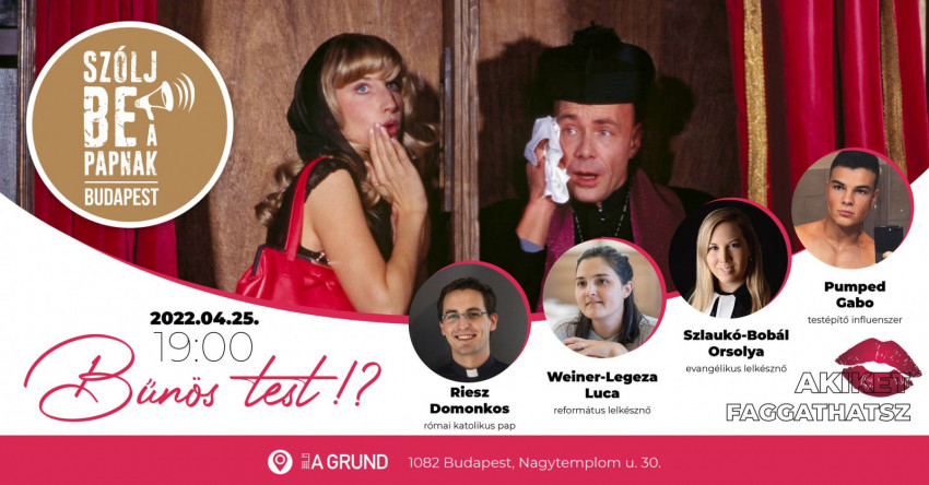 A kérdésekre Pumped Gabo testépítő influenszer, Riesz Domonkos római katolikus pap, Szlaukó-Bobál Orsolya evangélikus lelkésznő és Weiner-Legeza Luca református lelkésznő válaszolnak majd. A beszélgetés moderátora Zila Gábor, a Református Közéleti és Kulturális Alapítvány ügyvezetője lesz.