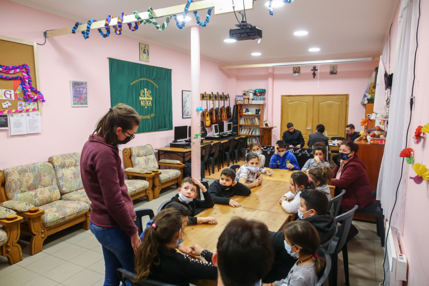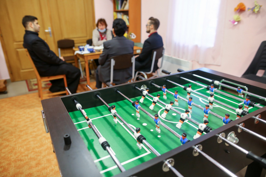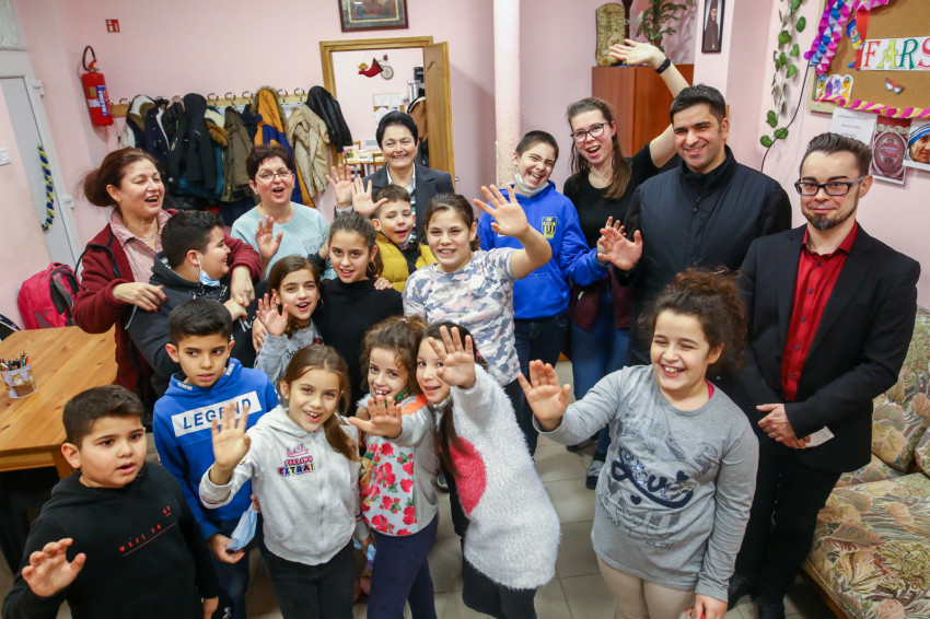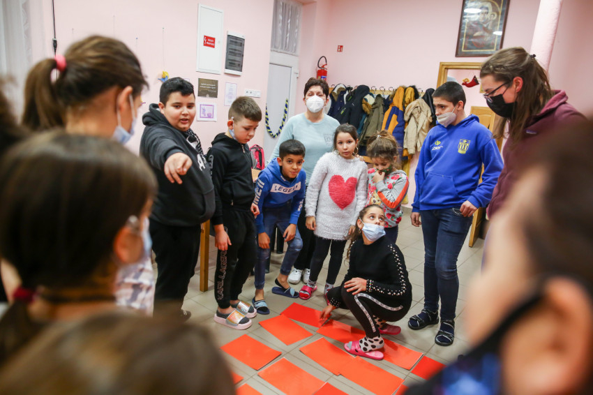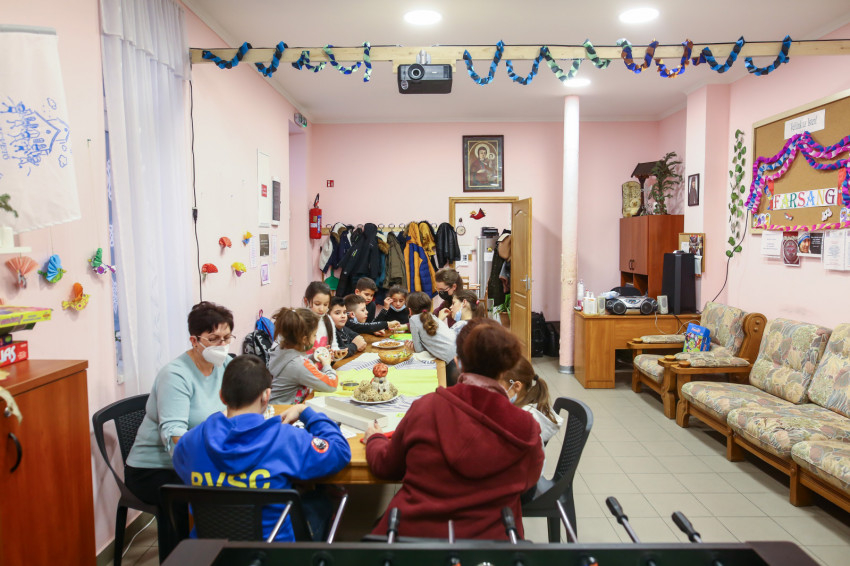 Az épületben a legtágasabb helyiség a közösségi tér; középen asztalok, a falak mentén polcok, rajtuk könyvek, társasjátékok. A terem egyik végében számítógépek, a sarokban nagy szőnyeg. A mennyezetre szerelve vetítővászon és projektor. Ez utóbbiakat abból az összegből vásárolták, amit a nemzetközi romahimnusz-feldolgozásukkal nyertek, ugyanis első helyezést értek el. A falon sok-sok dekoráció, a faliújságon farsangi díszek. A teremből az egyik ajtó a kápolnára nyílik. Ez az imádság és a vasárnapi szent liturgiák helye. A másik oldalon a teakonyha, ahol a technikai alkalmazott, aki egyúttal szakács is, minden este valamilyen finomságot készít a gyerekeknek. „Igyekszünk meleg ételt adni nekik. Tejbegrízt, tejberizst, hot-dogot, bundás kenyeret, olyasmit, amit szívesen elfogyasztanak, és laktatóbb is, mint egy szendvics. A hónap végén mindig nagyobb az étvágyuk, otthon akkor már kevesebb jut” – mondja Ede atya.