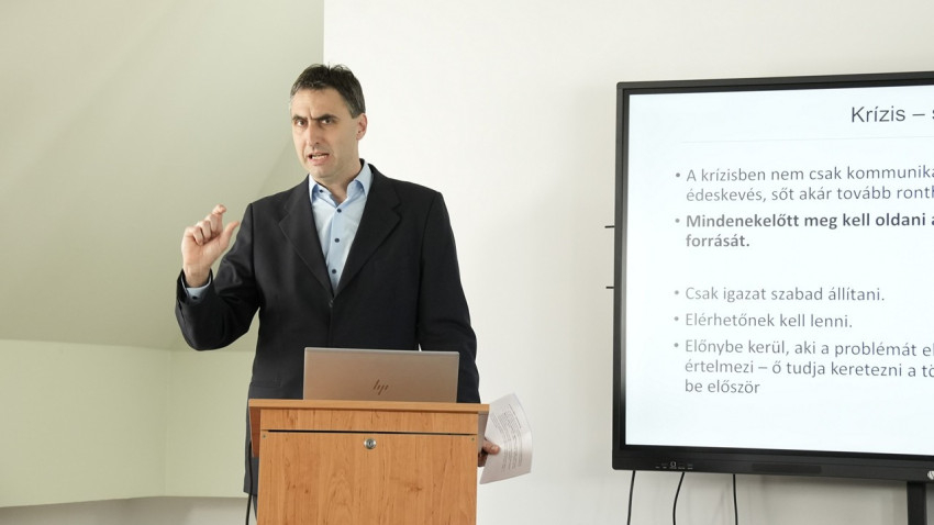 Gianone Péter az NMHH senior kommunikációs szakértője, a Magyar Rádió volt hírszerkesztője, az MTI volt főszerkesztő-helyettese az Ellenszélben is tudatosan – Kommunikációs alapvetések krízis idején című előadásában a kríziskommunikáció sajátosságait ismertette a mindennapi életből vett kényes és kellemetlen példákon keresztül.