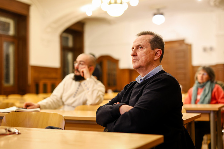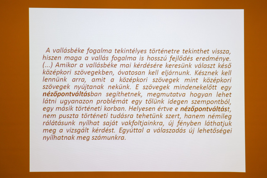 Bakos Gergely OSB kutatási területe a középkori filozófia, és mint aki e korból származó szövegekkel foglalkozik, előadása módszertani bevezetőjében egyfajta nézőpontváltást javasolt a hallgatóságnak: szükségesnek tartotta leszögezni, hogy amikor a vallásbéke mai kérdésére keresünk választ késő középkori szövegekben (ezúttal Cusanus és Pico della Mirandola műveiben), óvatosan kell eljárnunk. A középkori szövegeket mint saját koruk világnézeti keretei közt született szövegeket kell olvasnunk.