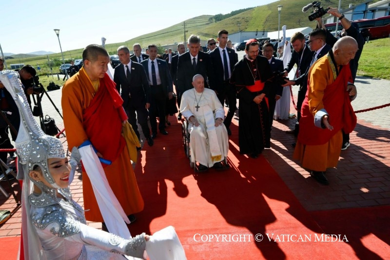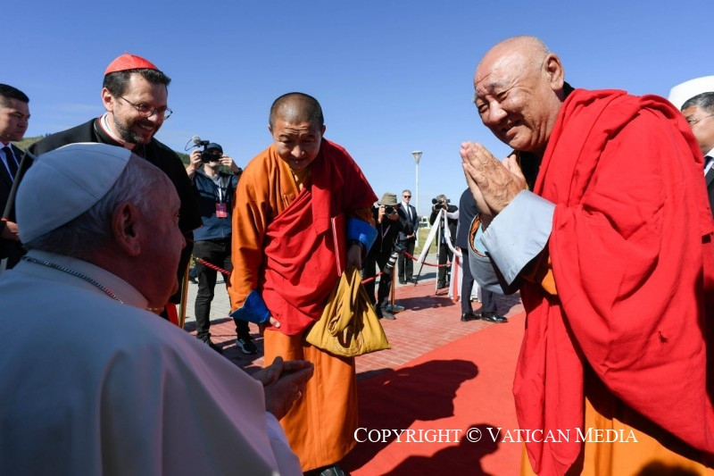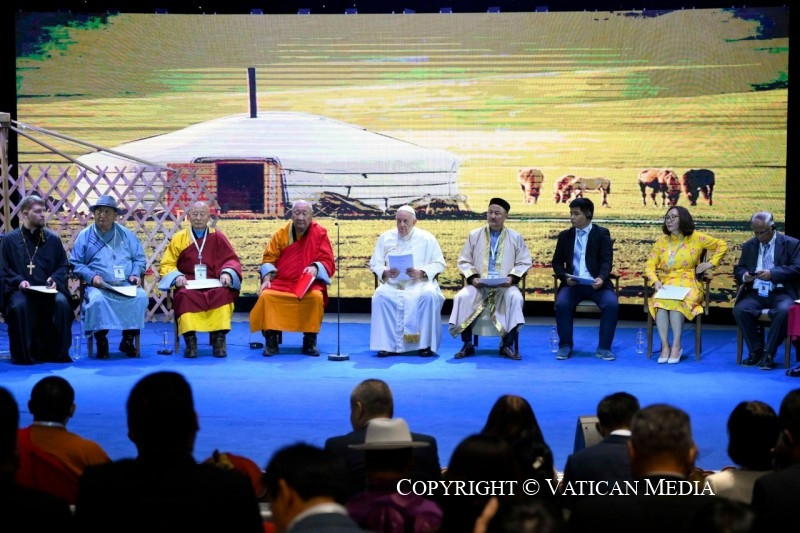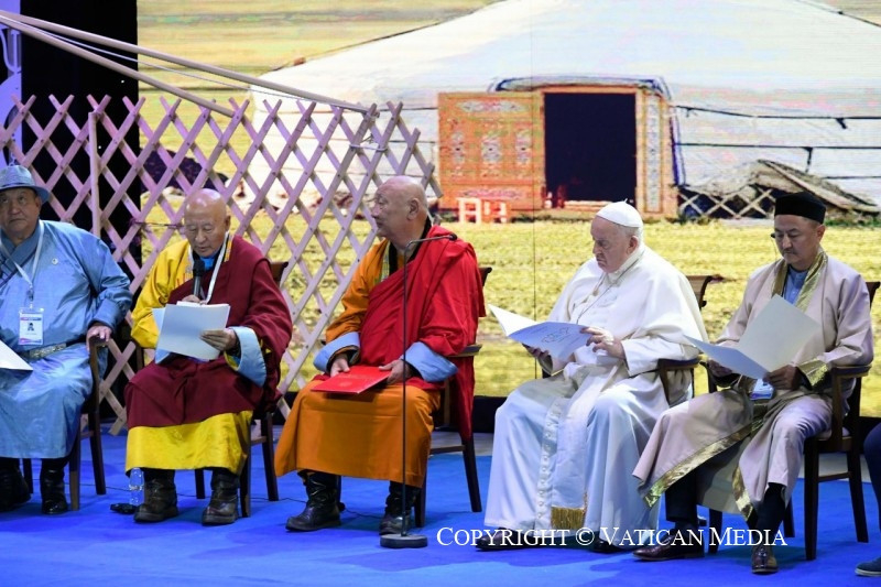Engedjétek meg, hogy így szóljak hozzátok, a Krisztus-hívők hittestvéreként és mindannyiatok testvéreként, a közös vallási keresésnek és az egyazon emberiséghez tartozásnak a nevében. Vallási vágyakozásában az emberiség vándorok közösségéhez hasonlítható, mely égre emelt tekintettel jár a földön. Sokatmondó ezzel kapcsolatban, amit egy messziről jött hívő mondott Mongóliáról. Azt írta, hogy ide utazva „nem látott mást, csak eget és földet” (Guglielmo di Rubruk [Rubruk Willelmus]: Viaggio in Mongolia [Utazás Mongóliába], XIII/3, Fondazione Lorenzo Valla – Mondadori, Milano, 2014, 63). Az oly világos és kék ég itt valóban átöleli a hatalmas, végeláthatatlan földet, felidézve az emberi élet két alapvető dimenzióját: a földit, mely a másokkal való kapcsolatokból áll, és a mennyeit, mely a bennünket meghaladó Másik kereséséből áll. Mongólia tehát arra emlékeztet bennünket, hogy mindannyiunknak, zarándokoknak és vándoroknak felfelé kell néznünk, hogy megtaláljuk a helyes útirányt a földön.