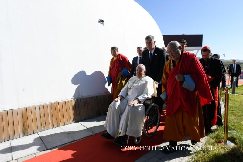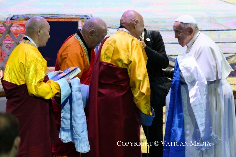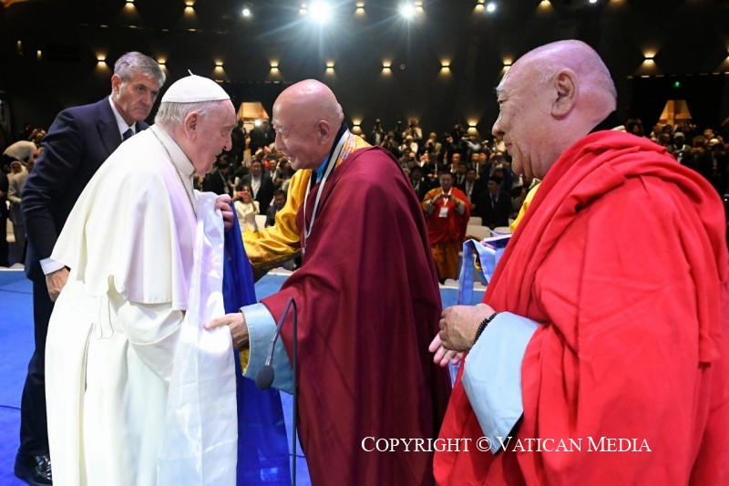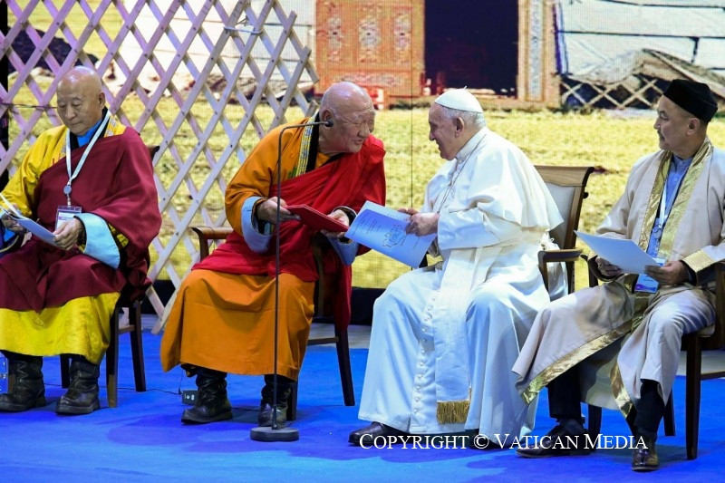 Nem keverhetjük tehát össze a hitet és az erőszakot, a szakralitást és a másokra erőltetést, a vallási utat és a szektásságot. A múlt szenvedéseinek emléke – különösen a buddhista közösségekre gondolok – adjon erőt ahhoz, hogy a sötét sebeket fényforrássá, az erőszak esztelenségét életbölcsességgé, a romboló rosszat építő jóvá változtassuk. Így legyen ez velünk is, spirituális mestereink lelkes tanítványaival és tanításaik lelkiismeretes szolgáival, akik barátságos útitársakként készek vagyunk felkínálni a szépséget azoknak, akiket kísérünk. Legyen ez így, mert a pluralista és a demokratikus értékekben hívő társadalmakban, mint amilyen Mongólia, minden vallási intézménynek, melyet a polgári hatóság rendszerint elismer, kötelessége és mindenekelőtt joga, hogy mások lelkiismeretének tiszteletben tartásával és mindenki nagyobb javát célul kitűzve felkínálja azt, ami ő maga, és amiben hisz.