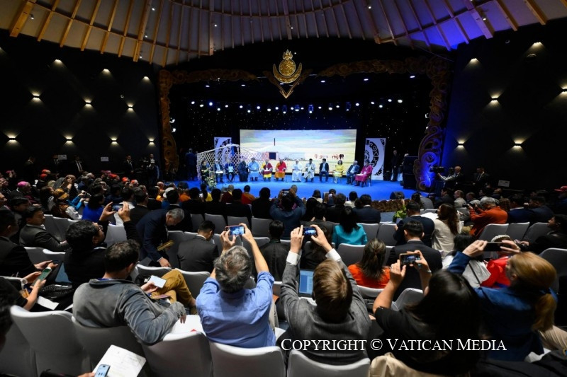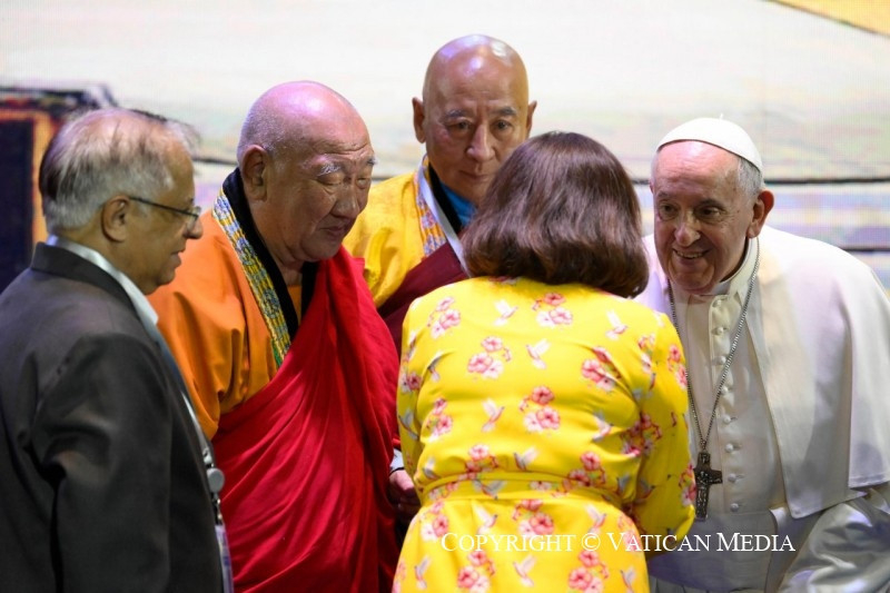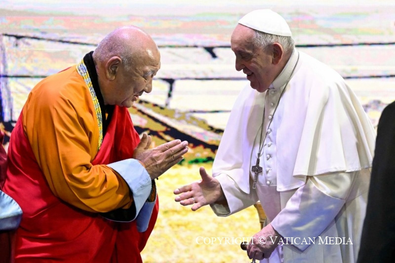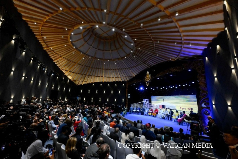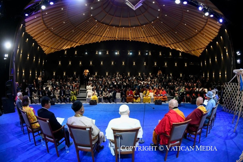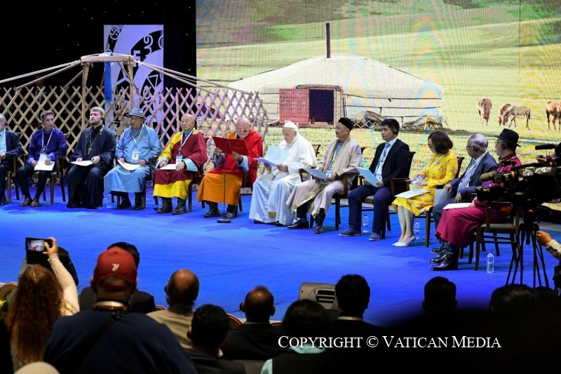 Ázsia sokat nyújthat e tekintetben, és Mongólia, mely e földrész szívében fekszik, a bölcsesség nagy örökségét őrzi, melyet az itt elterjedt vallások hoztak létre, és amelynek felfedezésére és megbecsülésére szeretnék hívni mindenkit. Szeretném megemlíteni – anélkül, hogy részletezném – e bölcsességi örökség tíz aspektusát. A tíz aspektus: jó kapcsolat a hagyományokkal, a fogyasztói szemlélet kísértései ellenére; tisztelet az idősebbek és az ősök iránt – mekkora szükségünk van ma generációs szövetségre köztük és a legfiatalabbak között, párbeszédre a nagyszülők és unokáik között! Aztán a környezetnek, közös otthonunknak a gondozása, egy másik rendkívül aktuális szükséglet: veszélyben vagyunk! Továbbá: a csend és a belső élet értéke, mely lelki ellenszer a mai világ sok bajára. Aztán az igénytelenség iránti egészséges érzék; a vendégszeretet értéke; a dolgokhoz való ragaszkodásnak való ellenállás képessége; az emberek közötti kötelékek kultúrájából fakadó szolidaritás; az egyszerűség megbecsülése. És végül egyfajta egzisztenciális pragmatizmus, mely kitartóan keresi az egyén és a közösség javát. Ez a tíz annak a bölcsességi örökségnek néhány eleme, amelyet ez az ország a világnak kínálhat.