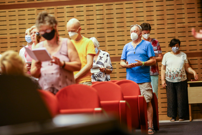 A szombati napra látogattunk el, amely szentségimádással és tornával kezdődött. Kilenc órakor laudesre gyűltek össze a lelkigyakorlatozók a hittudományi főiskola előadótermében. A Jézus- és a Mária-ikon előtt a Nyolc Boldogság Közösség négyszólamú, az adott napnak megfelelő himnuszait, zsoltárait és énekeit imádkozták a résztvevők a Szentlelket hívva, Istent dicsérve. A szabad imádság és a Miatyánk után Máriát köszöntötték, akinek „tündöklése tiszta, mint a napvilág”.