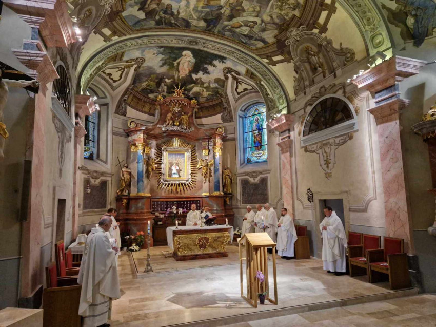 Kisebb pihenő után mindenki bejárhatta a Cserhát lankáival körülölelt kegyhelyet. 13.30-tól a loretói litániát vezette a főpásztor, mely alatt a paptestvérek elvégezhették szentgyónásukat a ferences atyáknál. 14 órától koncelebrált szentmise következett, majd egyenként járulhattunk rövid fohászra a kegyszobor elé.