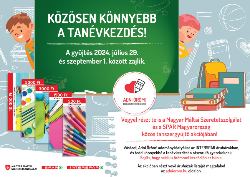 Aki a megfelelő tanszerek kiválasztását inkább a Máltai Szeretetszolgálatra bízná, az július 29. és szeptember 1. között 500, 1500, 3000, 5000 és 10000 forintos címletű adománykártyákat vásárolhat az INTERSPAR-okban és a SPAR online shopban. Az így összegyűlt adományokat a karitatív szervezet tanszerekre, ceruzákra, füzetcsomagokra, írószerekkel teli tolltartókra, iskolatáskákra váltja, és mindezt a tanévkezdés előtt eljuttatja a rászoruló családokhoz.