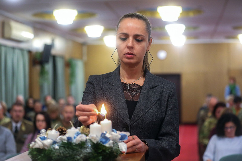 Az adventi áhítaton Kurtán Krisztina, a Honvédelmi Minisztérium gazdálkodási ügyekért felelős helyettes államtitkára gyújtotta meg az adventi koszorú első gyertyáját.