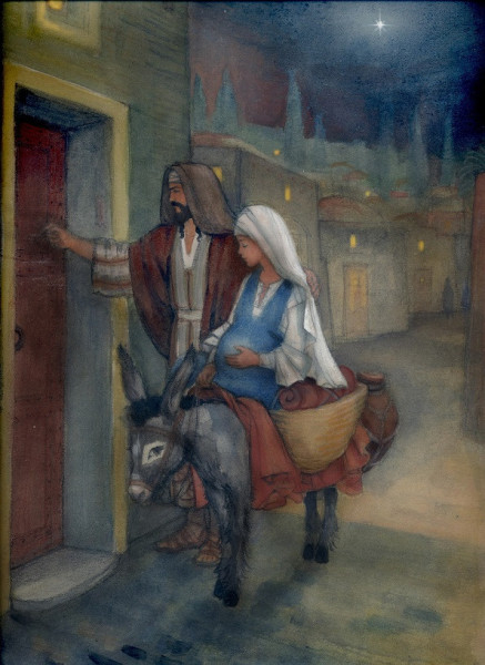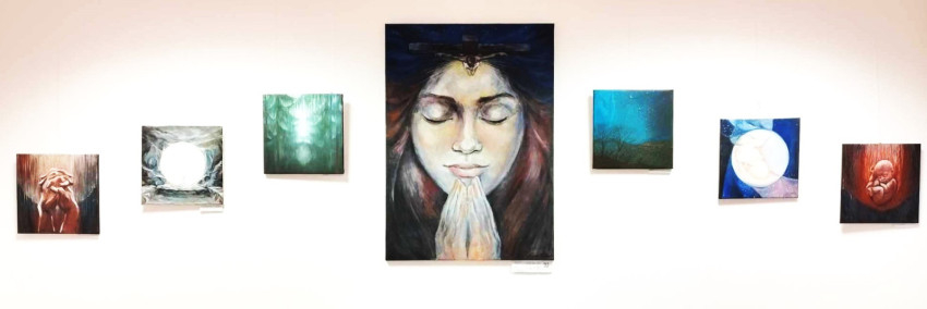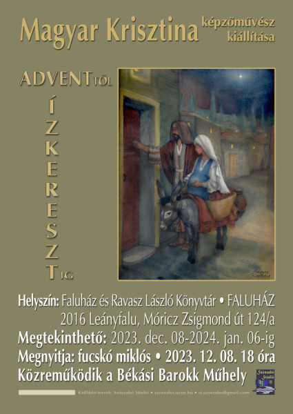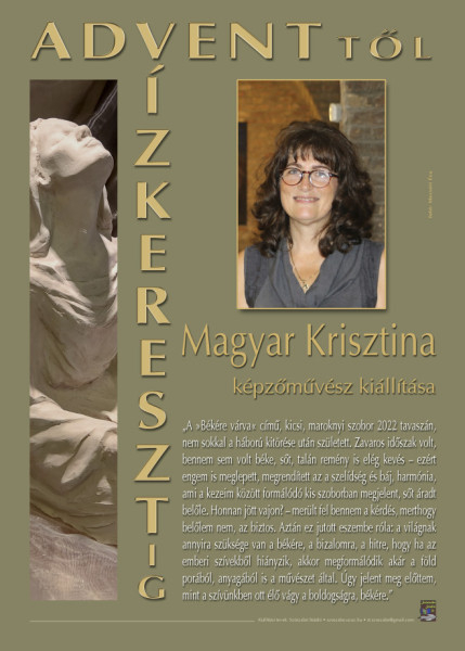 A kiállítás nyitóképe is a szüléshez szállást kereső Szent Családot ábrázolja, akik nem találtak méltóbb helyet az Isten Fiának megszületéséhez, mint egy istállót. Ezzel szemben Magyar Krisztina adventi lelkületű képei és kiállított szobrai, valamint a Szent Margit Gimnáziumban harminc négyzetméteren megvalósult – Irgalmas Jézust ábrázoló – üvegablakai (aminek fotóit is láthatjuk Leányfalun) a békére vágyakozás lenyomatai; örömhír arról, hogy megszületett, reményt ad és felemel magához az a csoda, ami a világba érkezett, s ami az alkotó minden alkotásán átsugárzik.