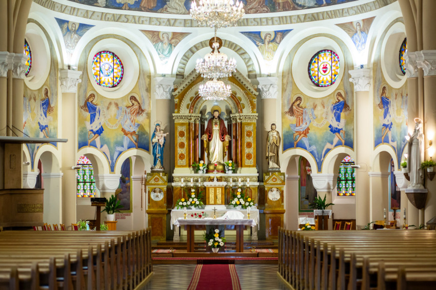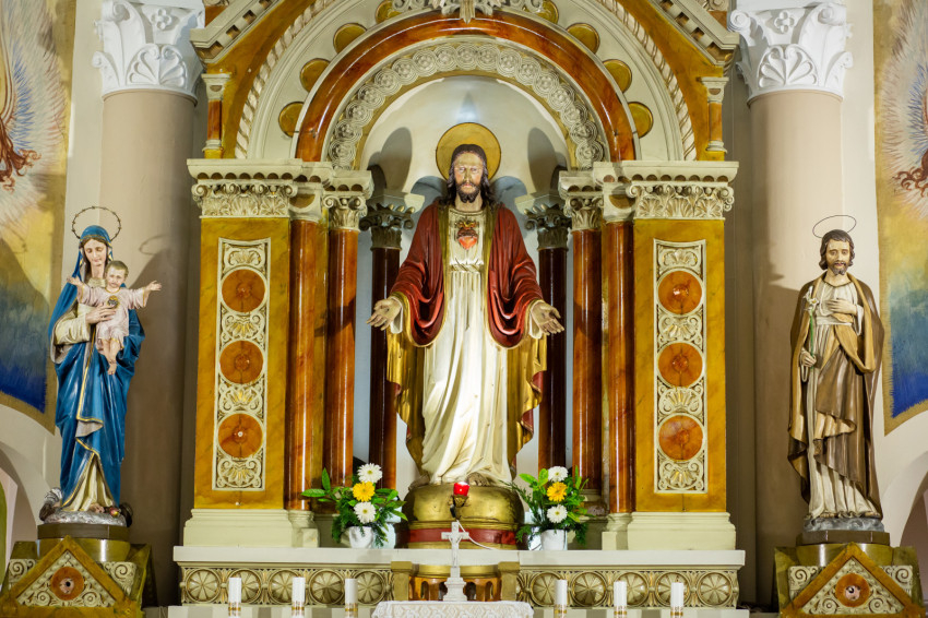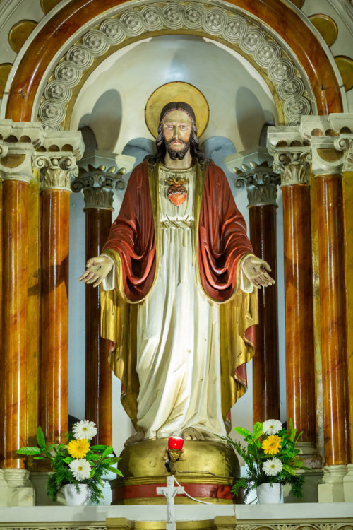 Belépve azonnal feltűnik a főoltár Jézus Szíve-szobra, mely különleges: