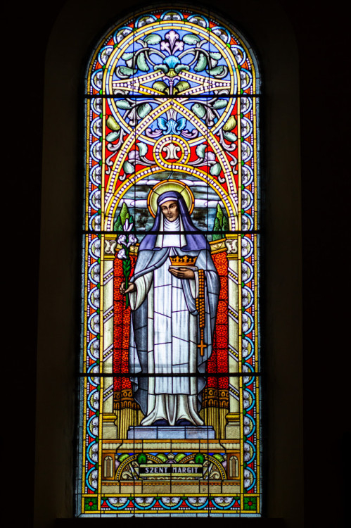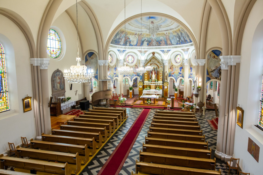 A kereszthajóban Szent Erzsébet- és Szent Imre-mellékoltárok, felettük üvegablakok, a templom végében kétoldalt Fájdalmas Anya- és Szent Rita-oltár kapott helyet. A templomhajó szenteket ábrázoló üvegablakai a nyolcvanas évek végén készültek adományokból. Alexandriai Szent Katalint, Szent Jánost, Szent Margitot és Szent Lászlót ábrázolják, a kóruson pedig Keresztelő Szent Jánost és a gyermek Jézust. A templom legrégebbi része a hatregiszteres orgona. A villám, mivel ez az épület a legmagasabb a környéken, tönkretette azt az orgonát, amely a templom kereszthajójában állt.