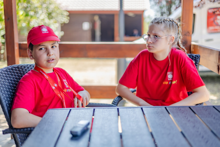 Két táborozó, Lőrincz János és Molnár Viola szívesen válaszolt a kérdéseimre, megosztották velem életük körülményeit, magasságokat és mélységeket. Beszámoltak arról is, hogy első nap a csoportok védőszenteket választottak maguknak, második nap sokat fürödtek a Balatonban, ma pedig délután busszal elmennek a sümegi várba, ahol lovagi játékokon is részt vesznek.