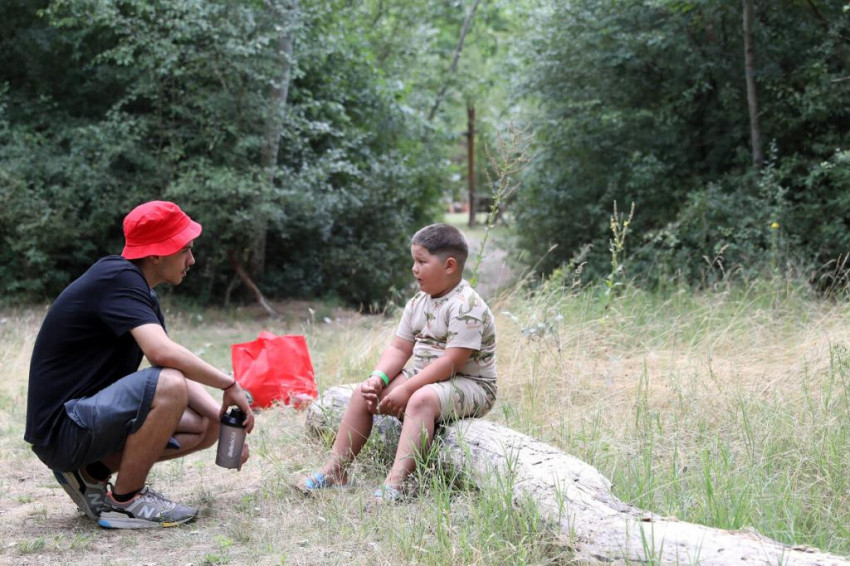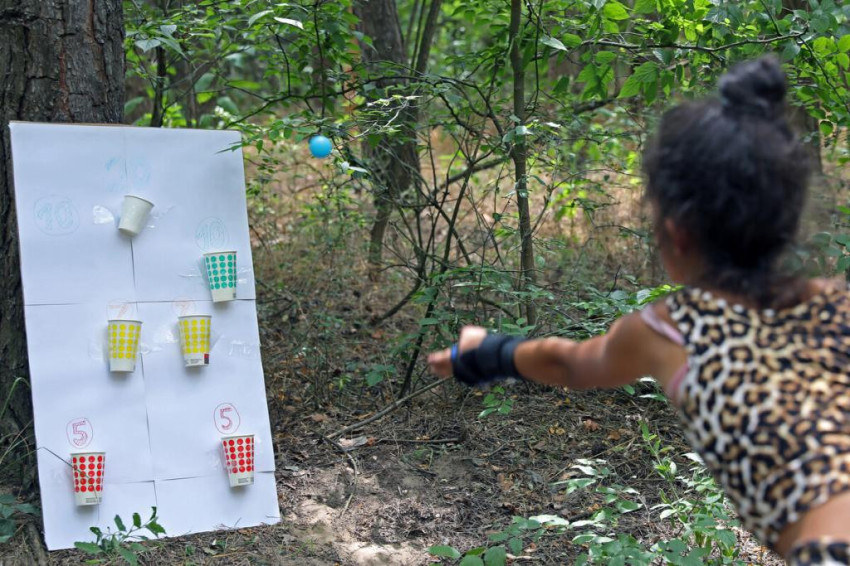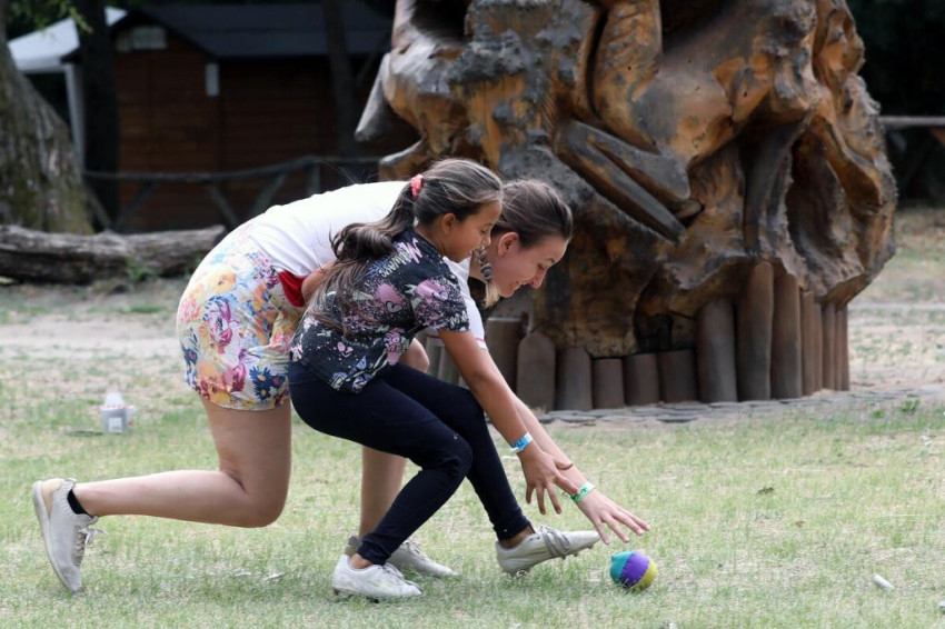 Hegyessy Bori és Fábián Berta, két fiatal önkéntes lány mesélt az első napról, amikor törzsi pajzsot készítettek, aztán kvízt töltöttek ki Afrikáról. A monori Kistónál sportversenyt rendeztek, volt mocsárjárás, bukósisakra tett cserépben labdát kellett egyensúlyozni, zsákban kellett ugrálni. Mindketten nagyon szívesen jönnek, évek óta visszajárnak, Bori már hat éve is ott volt az első táborban.