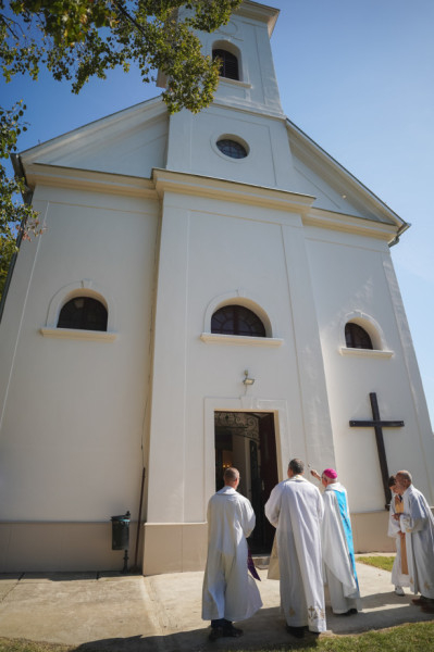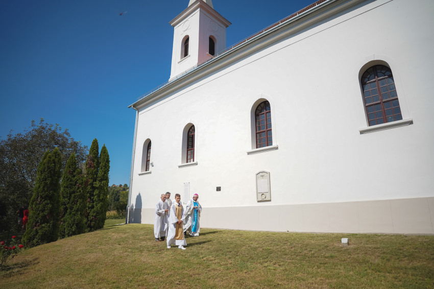 Az áldás szavait követően Varga László kaposvári megyéspüspök meghintette szenteltvízzel a külsőleg felújított templomot.