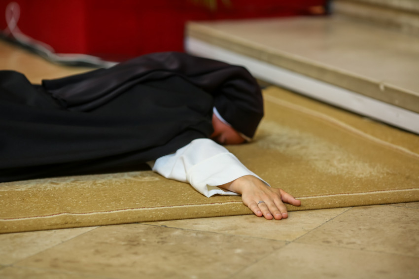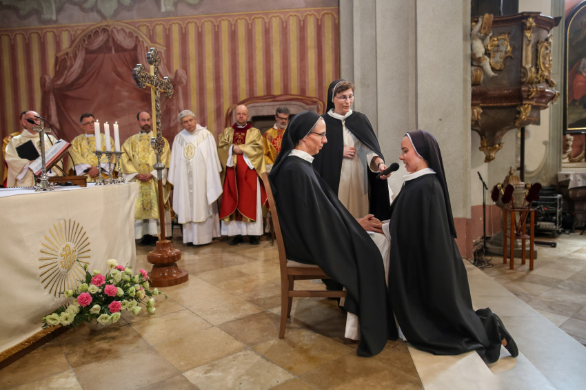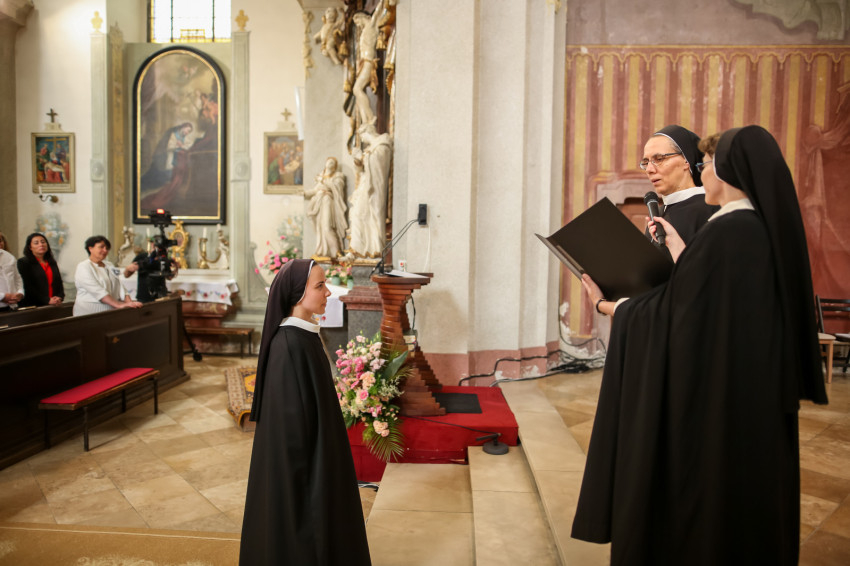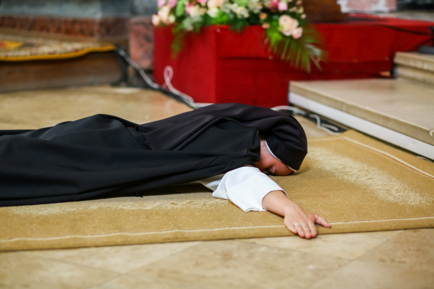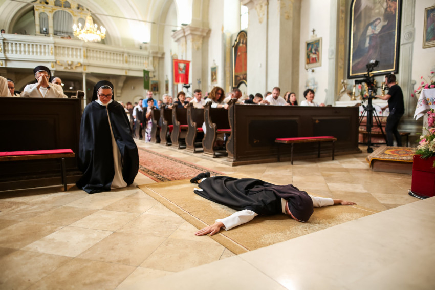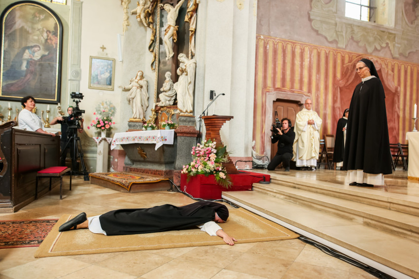 Az evangélium elhangzása után Bernadett nővért a magisztra középre vezette az elöljáró elé. Mit kívánsz? – tette fel Kakucs Adél Petra általános főnöknő a fogadalmat tevőnek a kérdést. Isten irgalmát és a tiéteket – válaszolta Bernadett nővér, majd véniát tett, a földre borulva fejezte ki önátadását Jézusnak és meghalását a világnak.