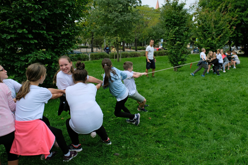 Nem messze tőlünk Kürti Zoltán kötélhúzással várja a gyerekeket, akik nagyon figyelnek, tudják, hogy sípszóra, és nem a becsapós tapsra foghatják meg a kötél két végét. A testnevelő azt is elmondja nekik, hogy